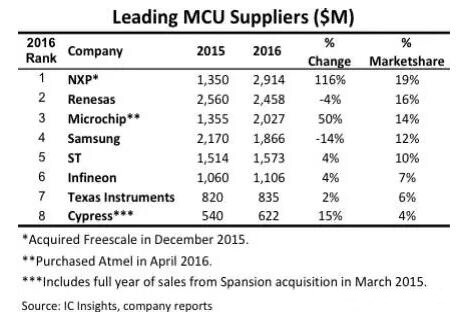 隨著物聯(lián)網(wǎng)領(lǐng)域應(yīng)用對(duì)MCU需求的進(jìn)一步增長(zhǎng)。為了搶占市場(chǎng)份額,供應(yīng)商們進(jìn)行了多次的并購(gòu),并最終改變了MCU的供應(yīng)商排名。根據(jù)IC Insights的統(tǒng)計(jì),全球最大的MCU供應(yīng)商由收購(gòu)了Freescale的NXP擔(dān)當(dāng),而Microchip、Cypress也通過(guò)收購(gòu),提高營(yíng)收,擴(kuò)大了在MCU市場(chǎng)的份額。但因?yàn)樵?016年,MCU的增長(zhǎng)并沒有那么明顯,那就沒有更多的收購(gòu)事件發(fā)生。