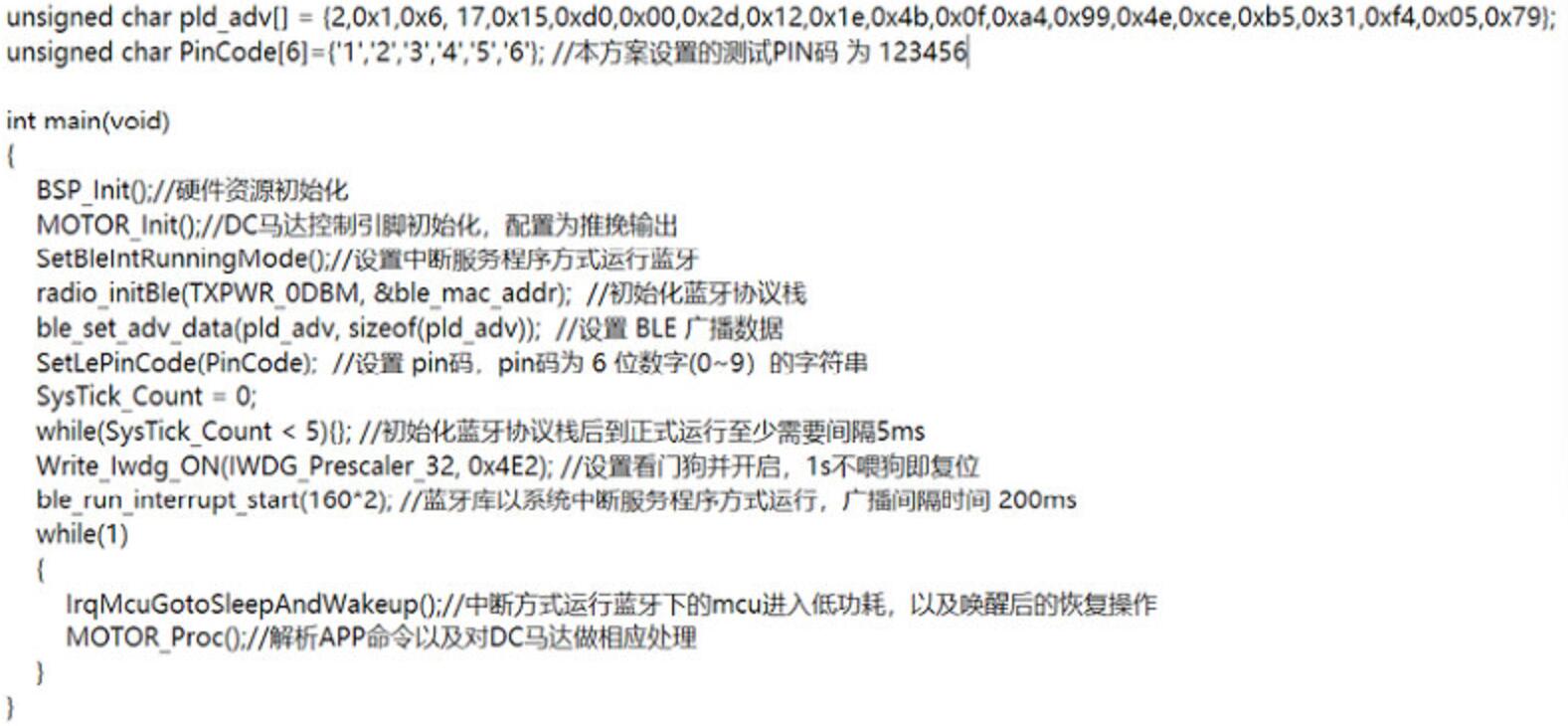 以下為主函數(shù)初始化配置內(nèi)容,主要將所有的外設(shè)資源和藍(lán)牙協(xié)議棧初始化,并且以中斷服務(wù)程序的方式運(yùn)行藍(lán)牙,主函數(shù)的循環(huán)中主要實(shí)現(xiàn)的功能為判斷是否進(jìn)入低功耗模式,并且喚醒后根據(jù)接收到的藍(lán)牙數(shù)據(jù)對DC馬達(dá)進(jìn)行不同的操作,代碼如下: