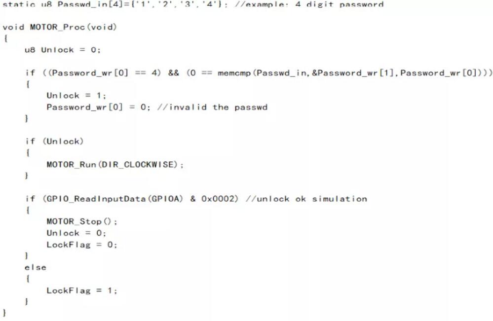 在MOTOR_Proc()處理函數(shù)中針對藍(lán)牙接收到的密碼數(shù)據(jù)進(jìn)行解析,如果與默認(rèn)設(shè)置的4位0-9數(shù)字密碼完全匹配上則操作解鎖,將DC馬達(dá)按照設(shè)定方向控制運(yùn)轉(zhuǎn),為了簡易驗(yàn)證,模擬一個(gè)信號表示解鎖成功,這里是通過采集指定IO引腳PA1的輸入來實(shí)現(xiàn),采集到輸入為高電平那么停止DC馬達(dá)轉(zhuǎn)動,且清零鎖定標(biāo)志位。以下為代碼實(shí)現(xiàn)內(nèi)容: