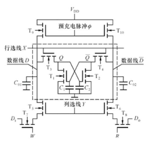 補充充電的過程:加預充電脈沖∅、預充電管T9、T10導電,CO1,C02很快充電至VDD,∅撤銷后,CO1,CO2上的電荷保持。然而進行讀出操作:地址有效,行、列選線X、Y高電平;R=1,W=0進行讀出操作,如果原信息為Q=“1”,說明MOS電容C2有電荷,C1沒有電荷(即T2導電,T1截止);這時CO1上的電荷將對C2補充充電,而CO2上的電荷經T2導電管放掉,結果對C2實現了補充充電。讀出的數據仍為,