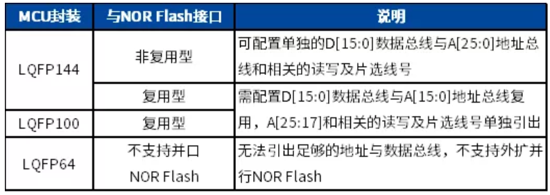 MM32F3270系列MCU因?yàn)榉庋b的原因,導(dǎo)致只有部分MCU產(chǎn)品可以通過硬件復(fù)用出全部或部分的FSMC接口的相關(guān)GPIO;外擴(kuò)NOR Flash也只有使用 LQFP144引腳封裝MCU芯片才能支持連接地址數(shù)據(jù)非復(fù)用和復(fù)用方式外擴(kuò)并行NOR Flash;而LQFP100引腳封裝芯片因地址線縮減,僅支持連接地址數(shù)據(jù)復(fù)用方式外擴(kuò)并行NOR Flash。LQFP64因?yàn)闊o(wú)法引出足夠的地址與數(shù)據(jù)總線,同樣不支持外擴(kuò)并行NOR Flash。目前市場(chǎng)上非復(fù)用型16位數(shù)據(jù)總線接口的NOR Flash也是較為普遍。