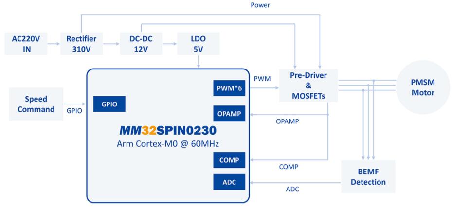 MM32SPIN0230為主控的低成本無刷高速吹風機單片機方案。