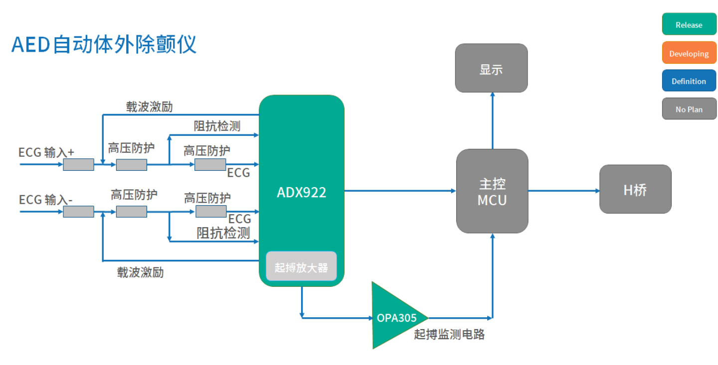 自動體外除顫器(AED)是心臟驟停急救中快速對患者心臟實施電擊來達到除顫,可以幫助普通人快速實施除顫。類比的ECG模擬前端可以快速準確地監控患者的心臟狀態,來實施準確高效的除顫效果。