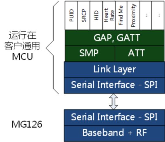 MG126使用獨創的創新架構設計,采用常見的SPI通信接口,芯片本身不需要額外的喚醒信號已節省MCU IO資源。前端芯片包含RF和BLE數字基帶,完成BLE廣播和數據的接收/發送和調制/解調以及基帶數據轉換。BLE協議棧運行在MCU上,復用MCU強大的處理和控制能力,提高了MCU的資源利用率。該芯片采用QFN16封裝,體積只有3mmX3mm。