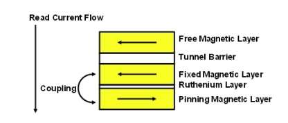 飛思卡爾半導體還通過增加兩個附加層來改進固定磁性層。在固定層下面增加了一層釕(Ru)。而在Ru層下面又增加了另一層稱為牽制層(pinning layer)的磁性層。固定層和牽制層的極性相反,將會引起很強的耦合。該強耦合使固定層的極性保持鎖定,因此不會在編程操作過程中引起誤反轉(圖4)。