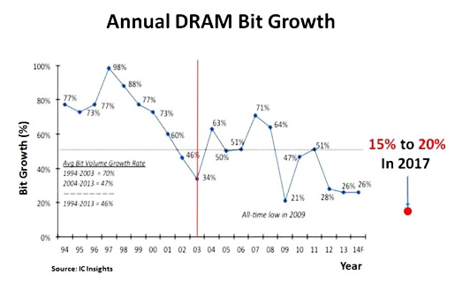 美光(Micron)表示,2017年DRAM供給位元預(yù)計(jì)成長(zhǎng)15-20%,可說(shuō)是近20年來(lái)最低的位元成長(zhǎng)率(bit growth)。如此低的位元成長(zhǎng)率,主要是因?yàn)镈RAM微縮限制。市場(chǎng)上有很長(zhǎng)一段時(shí)間都沒(méi)有任何有關(guān)DRAM微縮的消息了。當(dāng)供給位元成長(zhǎng)低于45%時(shí),這時(shí)就是賣方的市場(chǎng)了。因此,DRAM的寡頭壟斷、低位元成長(zhǎng)率,以及制造擴(kuò)張遲緩,導(dǎo)致長(zhǎng)期的供應(yīng)吃緊。最終的局面可能就是DRAM的價(jià)格不斷上漲,而供應(yīng)面卻不會(huì)有任何改變。
